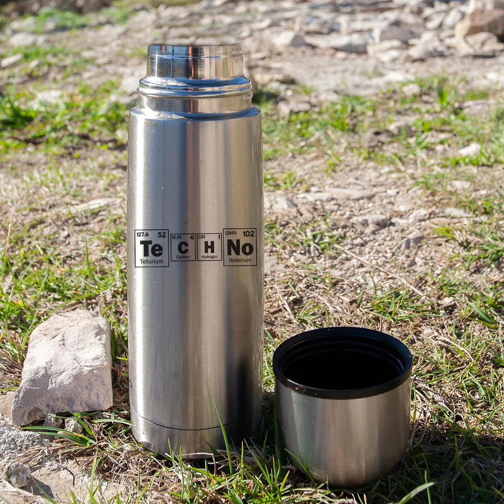 Zenés termosz, techno termosz. Egyedi Techno termosz, a techno zene kedvelő barátaidnak, családtagodnak vagy neked. Egy trendi  "Techno" feliratú termosz, nem mindennapi mintával a tied lehet, nincs más dolgod mint kiválasztani a termosz méretét és megrendelni azt.