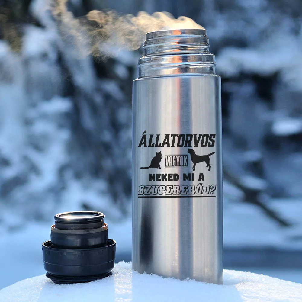 Termosz állatorvosnak, neked mi a szupererőd? Ez a feliratos termosz büszkén hirdeti a személy szuperképességét, az állatok gyógyítását. Az állatorvosi hivatás egy komoly dolog, de a jó hangulat elmaradhatatlan, amikor meglátja, ezt a feliratot biztosan mosolyt csal az arcára. Ha egy különleges és személyre szabott ajándékot keresel egy állatorvos számára, ez a termosz garantáltan örömet fog okozni. 500ml-es és 750ml-es változatban.