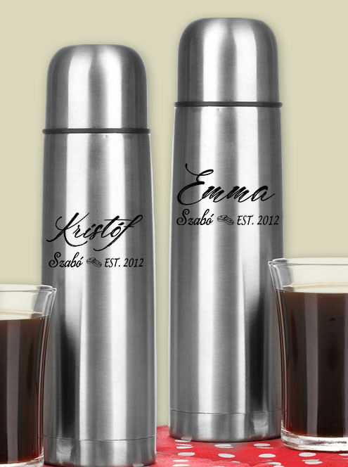 Páros termosz évfordulóra, neves ajándék. Névre szóló termosz nászajándékba vagy házassági évfordulóra. Személyre szabható egyedi adatokkal, esküvői dátummal és nevekkel, ami az összetartozásotokat jelképezi. Termosz mérete 500ml vagy 750ml, kupakja pohárként is használható, télen és nyáron is kitűnő választás.
