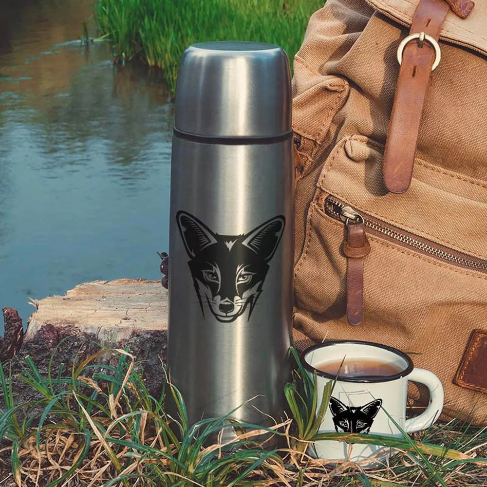 Vadász ajándék, rókás termosz. Rajzolt stílusú, fekete róka mintás termosz. Mindennapi használati tárgy egy olyan vadásznak, aki ravasz, mint egy róka különleges ajándék lehet születésnapra vagy névnapra.