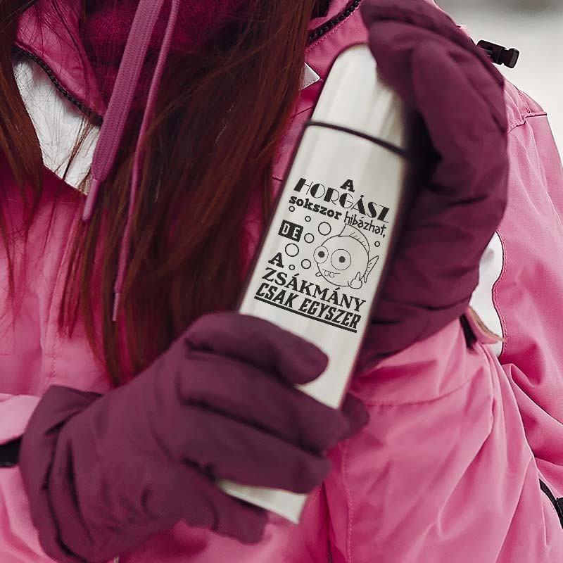 Vicces termosz horgásznak, a horgász sokszor hibázhat, de a zsákmány csak egyszer" felirattal ellátott termosz, mellyel megajándékozhatod horgász ismerősödet, barátodat vagy családtagodat.
