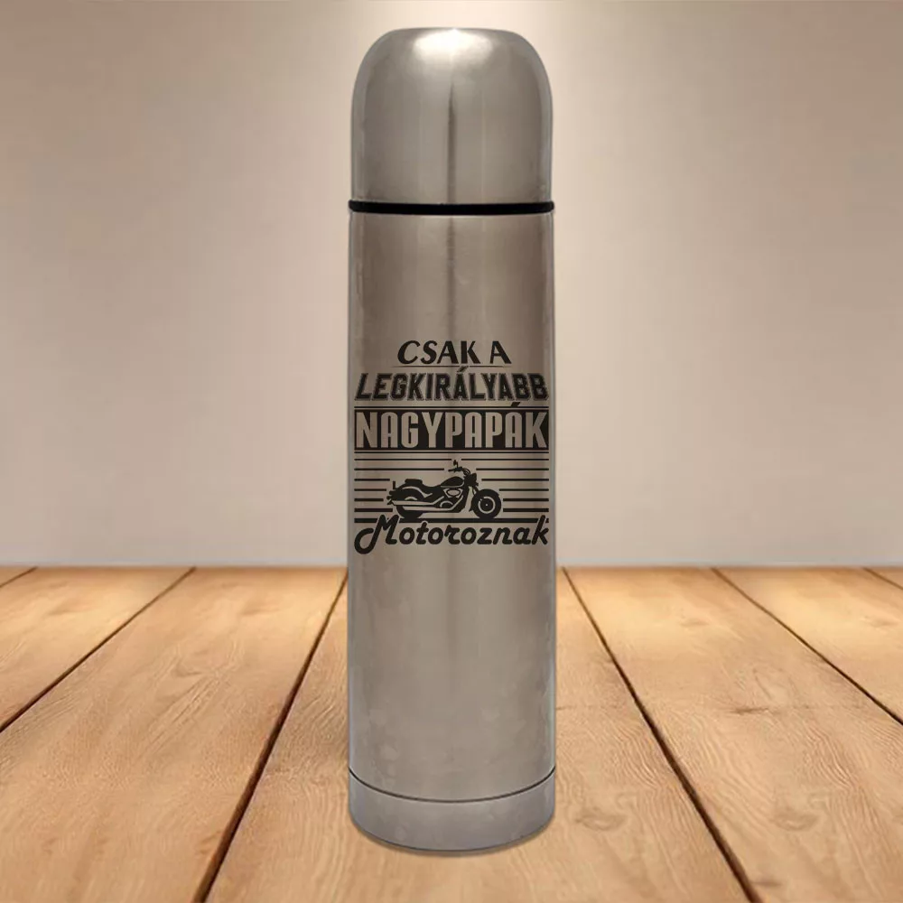 Ajándék nagypapának, motoros termosz nagypapának. Termosz férfiaknak csakis igazi motoros nagypapáknak. "Csak a legkirályabb nagypapák motoroznak" felirattal. Lepd meg vele nagypapádat apák napján, vagy egy motoros barátod.