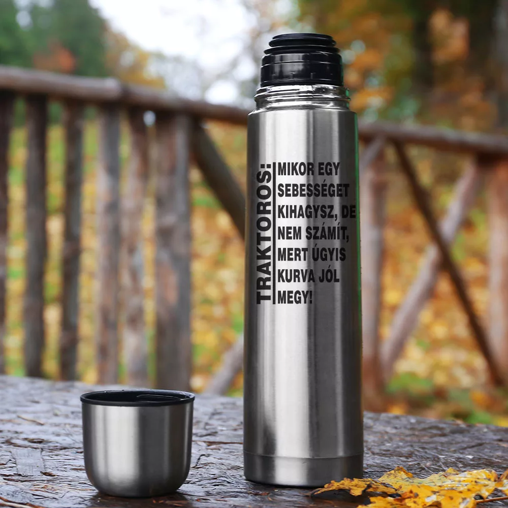 Vicces termosz traktorosnak, mikor egy sebességet kihagysz. Ajándék traktorosoknak, MTZ-t vezetőknek. Mikor egy sebességet kihagysz, de nem számít mert úgy is kurva jól megy. Ezt a mondatot biztos minden MTZ vezető ismeri. Használd munka közben ezt a termoszt és légy büszke a traktorodra.