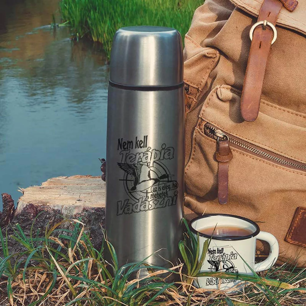 Feliratos vadász termosz, nem kell terápia, elég ha mehetek vadászni, egyedi termosz humoros felirattal. Ajándék egy olyan vadásznak, akinek kedvenc kikapcsolódása, hobbija a vadászat. Lepd meg egy termosszal, amit később magával vihet a vadászatra is.