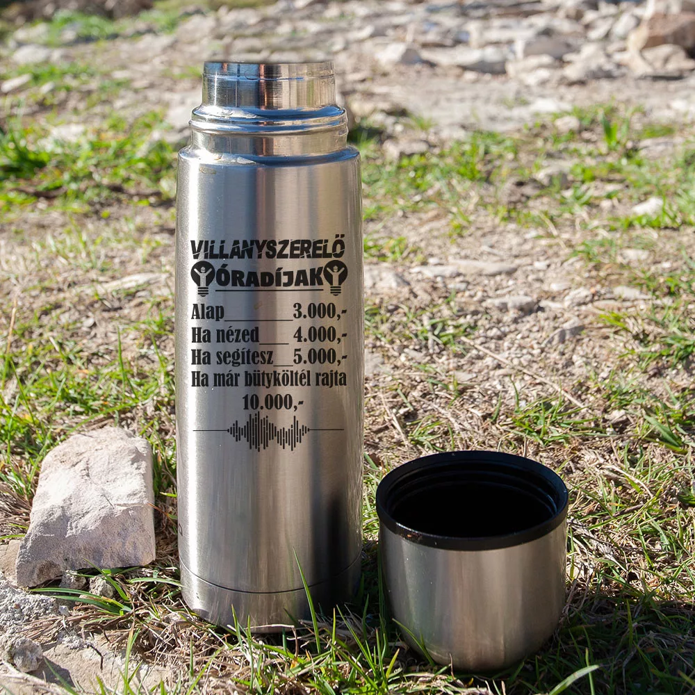 Szakmás termosz, villanyszerelési óradíjak. Vicces termosz villanyszerelőnek aki nem kedveli a magyarázkodó ügyfeleket. Lepd meg rokonodat, barátodat születésnapján vagy karácsonykor egy ilyen humoros szakmás termosszal, melyet télen és nyáron is magával vihet a munkába.