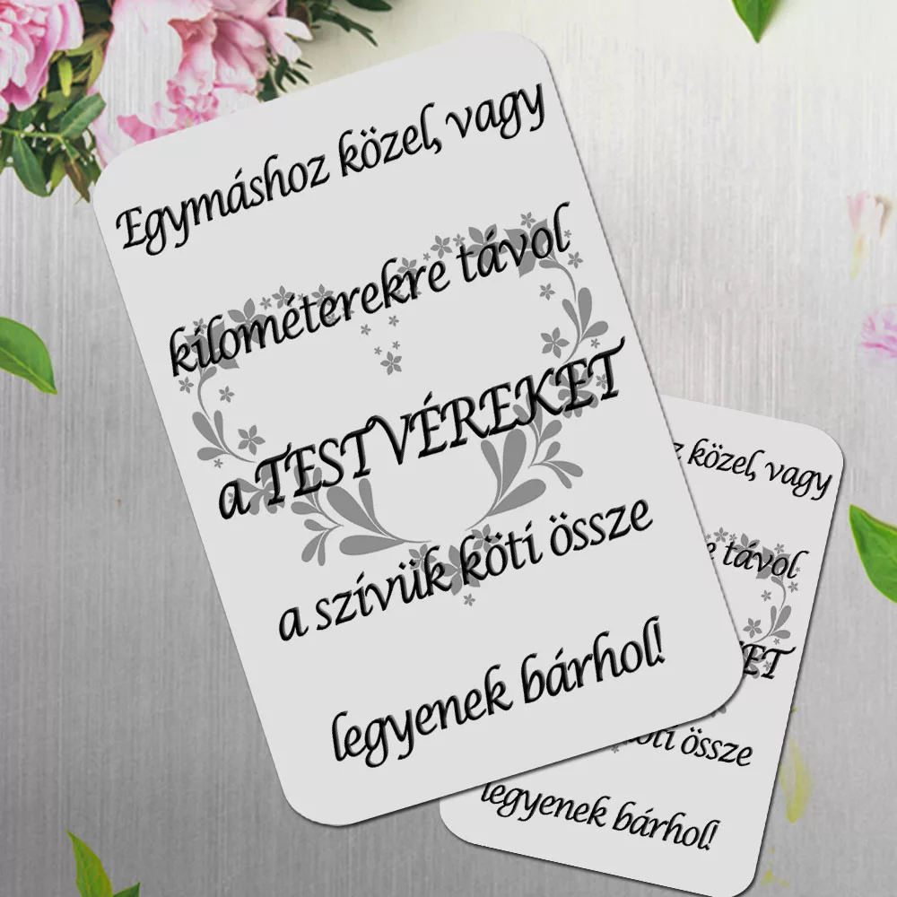 Hűtőmágnes testvérnek, kilométerekre távol. Egy megható és kedves ajándék testvérednek születésnapra, karácsonyra, akitől sokszor több kilométer is elválaszt. Egymáshoz közel vagy kilométerekre távol a Testvéreket a szívük köti össze legyenek bárhol. A hűtőmágnes anyaga 1 mm vastag mágnes lap, hátterének színe fehér (enyhén csillog). Mérete 9,0 x 6,5 cm.