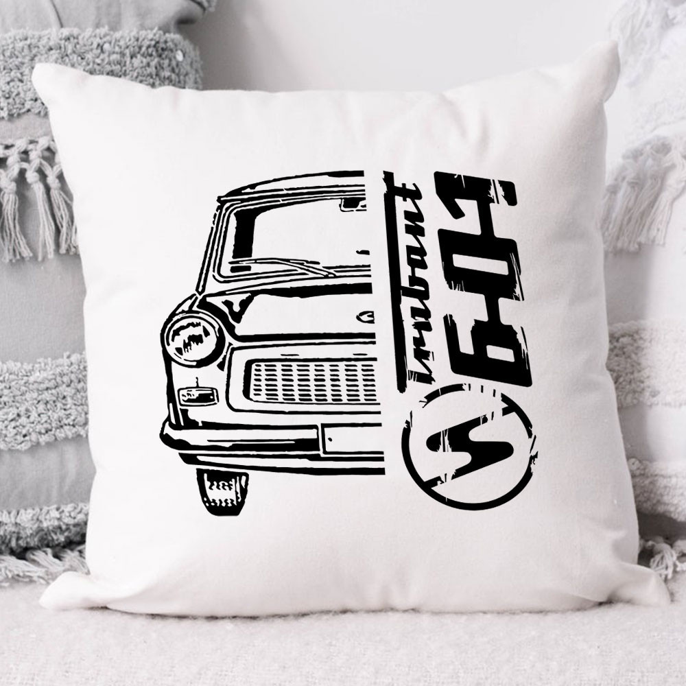 Trabant 601 párna, Trabis ajándékok. Trabant 601-es mintával ellátott párna, mellyel meglepheted családtagodat, barátodat, vagy magadat, ha ilyen autód van vagy rajongsz a retro autókért. A minta a párna fehér oldalára kerül a másik oldal színét Te választhatod ki.