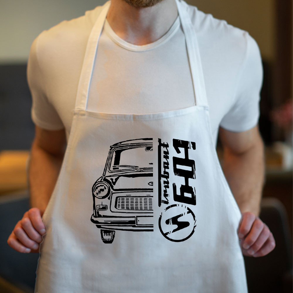 Trabant 601 kötény, Trabis ajándékok. Trabant 601-es mintával ellátott kötény, mellyel meglepheted családtagodat, barátodat, vagy magadat, ha ilyen autód van vagy rajongsz a retro autókért.