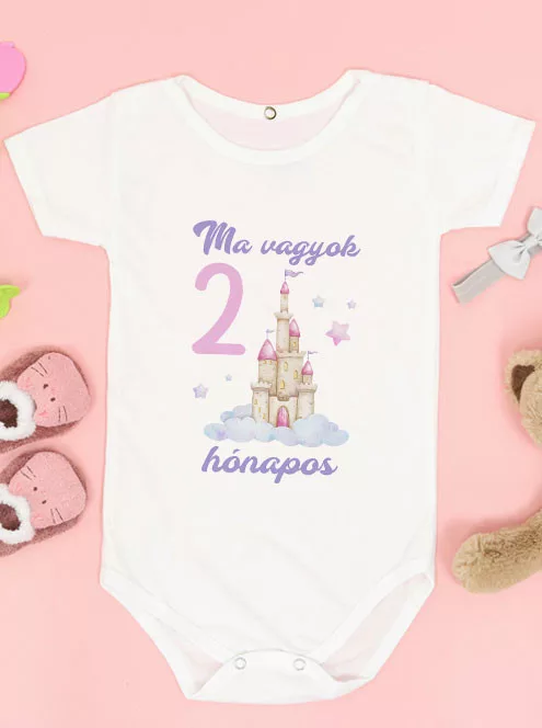 A második hónap is csupa varázslat ezzel a pasztell színvilágú bodyval! A "Ma vagyok 2 hónapos" felirat mellé meseszép kastélygrafika társul, igazi hercegnős hangulattal. Fehér színű, rövid ujjú, patentos, 100% pamut babaruha, amely ideális ajándék vagy emlékként is tökéletes.