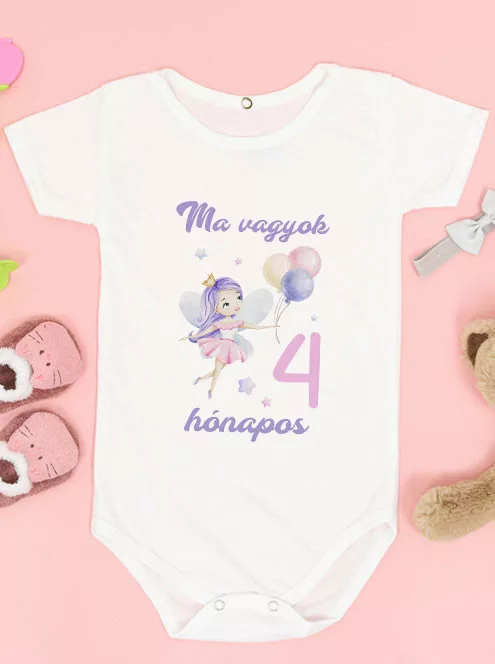 A negyedik hónapot egy bájos lufis tündérrel ünnepelheted! A "Ma vagyok 4 hónapos" felirat mellé csillogó csillagok és pasztell árnyalatok társulnak. A rövid ujjú, fehér, 100% pamut body kényelmes és aranyos viselet. Tökéletes választás ajándéknak vagy fotózáshoz.