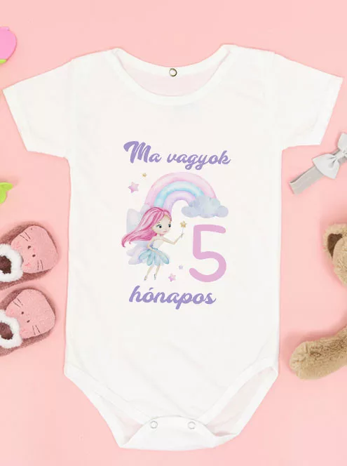 Ma vagyok 5 hónapos feliratos body szivárványos tündér grafikával igazi meseszerű darab. A pasztell árnyalatok és a pihe-puha, 100% pamut anyag együttese garantáltan kényelmet nyújt babádnak. Egyedi ajándékötlet babalátogatásra vagy fotózásra.