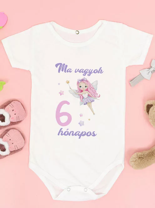 Fél éves lett a kis hercegnőd? Ünnepeljétek meg ezt a különleges pillanatot ezzel a "Ma vagyok 6 hónapos" feliratú tündéres bodyval! A fehér, rövid ujjú, 100% pamut anyagú babaruha csillagos részletekkel teszi még elbűvölőbbé az alkalmat.
