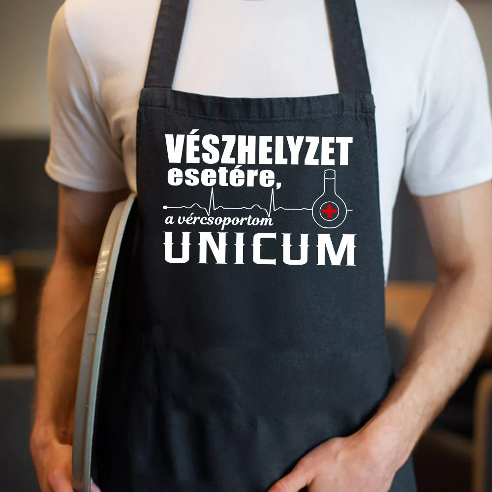 Alkohol vicces kötény, Unicum kötényAlkohol témájú feliratos vicces kötény Unicum kedvelőknek. Vészhelyzet esetére a vércsoportom Unicum felirattal tréfás ajándék szülinapra, névnapra vagy bármilyen olyan alkalomra amikor egy vicces ajándékot szeretnél átadni. A kötény fekete színben is rendelhető.