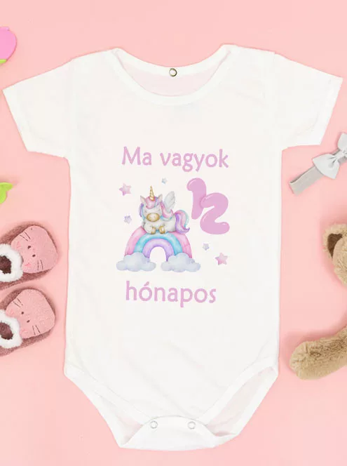 Egy teljes évnyi szeretet és növekedés – ez a különleges body méltó módon zárja le az első 12 hónapot. A színes, szivárványos unikornis és a „Ma vagyok 12 hónapos” felirat ünnepélyes hangulatot ad a baba megjelenésének. Ez a kombidressz ideális választás születésnapi fotókhoz, és tökéletes feliratos ajándék azoknak, akik maradandó meglepetést keresnek az első születésnapra.