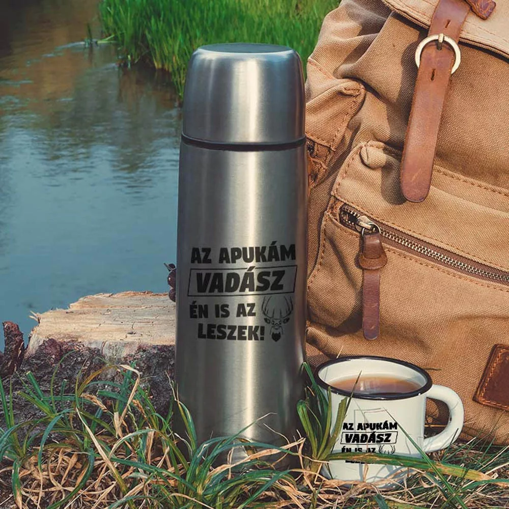 Termosz vadászoknak, az apukám vadász, én is az leszek feliratos termosz. Ha büszke vagy Édesapád hivatására és szeretnél a nyomdokaiba lépni egy ilyen termosszal Őt is büszkévé teheted.