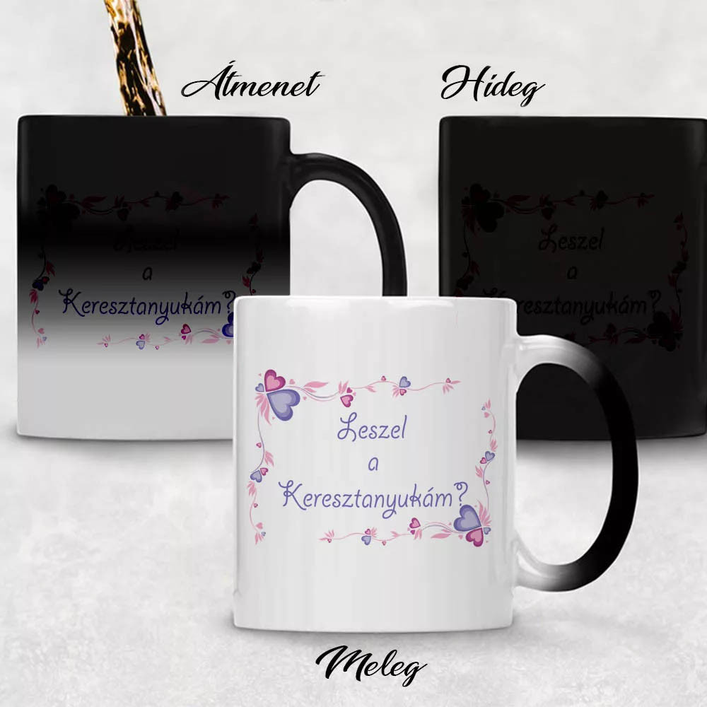 Színváltós bögrék, leszel a keresztanyukám. Nem mindennapi módon szeretnéd megkérni a kiválasztott nőt, hogy legyen keresztanyuka? Erre tökéletes választás ez a varázsbögre, melynek alapszíne fekete, de amint meleg italt töltenek bele látszódni kezd milyen feliratot rejt maga alatt.