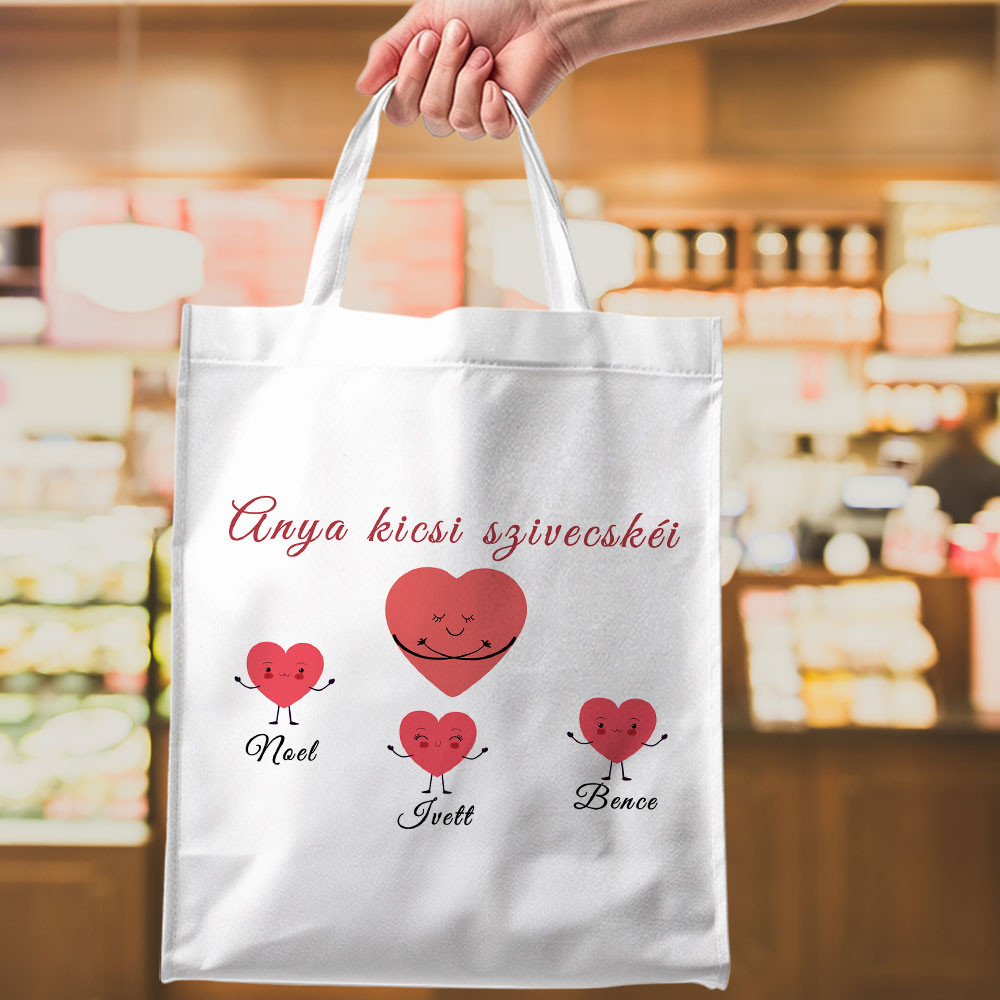 Táska anyák napjára, anya szivecskéi. Egy szívhez szóló anya kicsi szivecskéi vászontáska, személyre szabható gyermekek nevével a legjobb Édesanyának születésnapra, névnapra, anyák napjára. Kedves meglepetés anya kicsi szivecskéi vászontáska tökéletes akár ajándékcsomagolásként is, pl. hímzett törölközőkhöz, pólókhoz. A bevásárlótáskának is ideális szatyor mosógépben is mosható, a minta nem kopik le. A táska mérete 30x35 cm, a füle rövid.