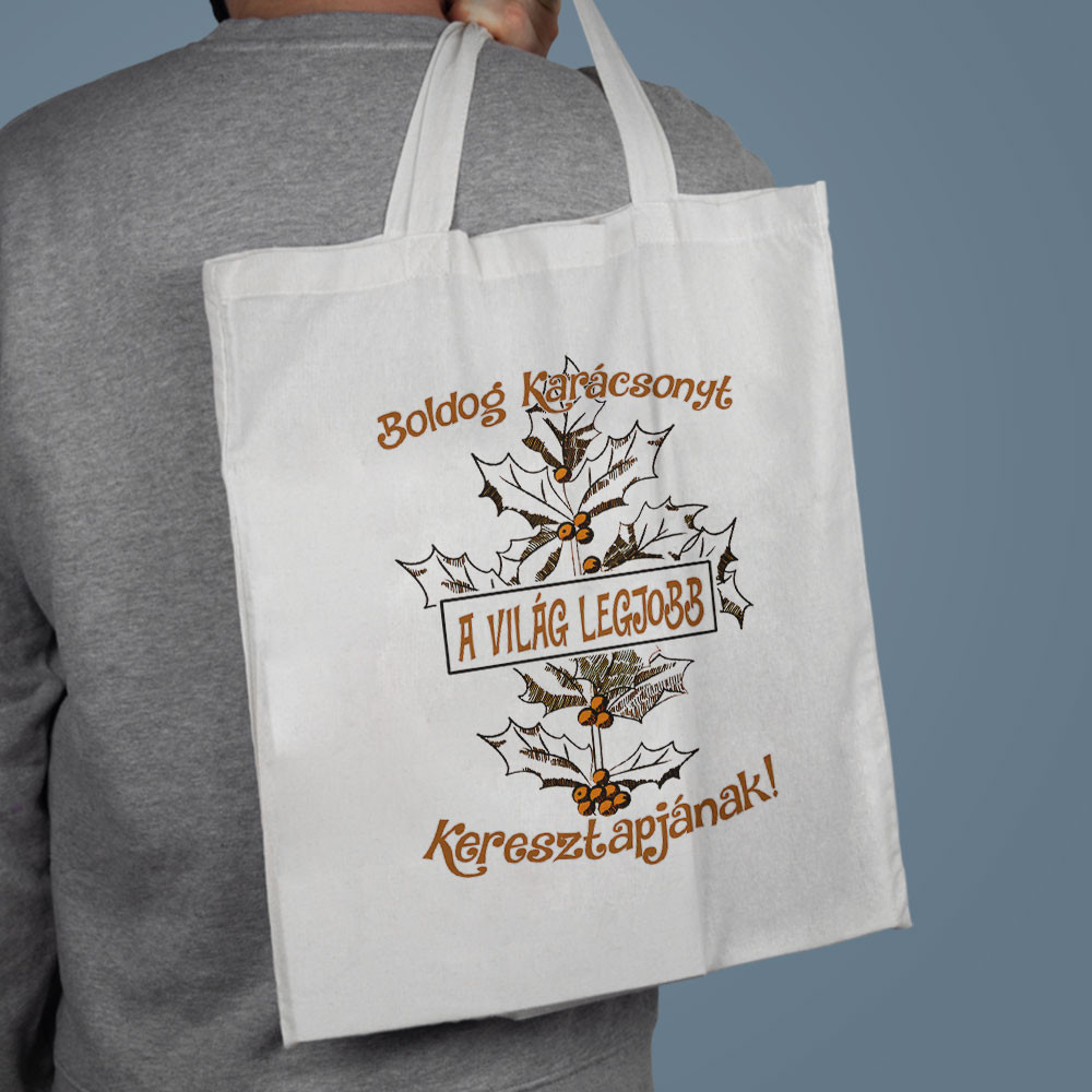 Karácsonyi táska, legjobb keresztapa. Boldog karácsonyt a világ legjobb keresztapjának, vászontáska, tartós mintával, örök emlék marad, amit használható díszcsomagolásként is ajándékodhoz vagy bevásárlótáskának.
