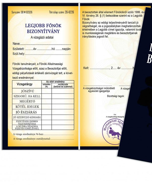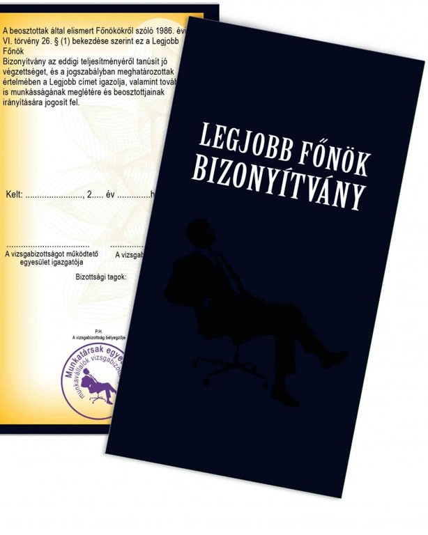 Vicces bizonyítvány a legjobb főnöknek. Névre szóló vicces ajándék főnöknek születésnapra, névnapra, karácsonyra ahol ebben az esetben az érdemjegyeket is Te osztod ki. Legjobb főnök bizonyítvány. Anyaga kemény papír, hasonlít az igazi bizonyítvány anyagához. Mérete: 18,5 x 20 cm.