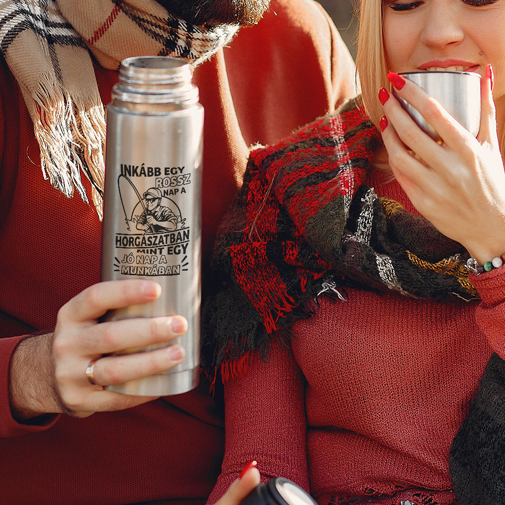 Pecás termosz, inkább egy rossz nap a horgászatban mint egy jó nap a munkában feliratú termosz. Egy igazi horgásznak, akik sosem adja fel még akkor sem ha nem akadt hal a horogra. Motiváld te is ismerősöd, családtagod ezzel a termosszal. A horgászoknak mindig szükségük van hideg vagy meleg italra, kiváló ajándék a tópartra.