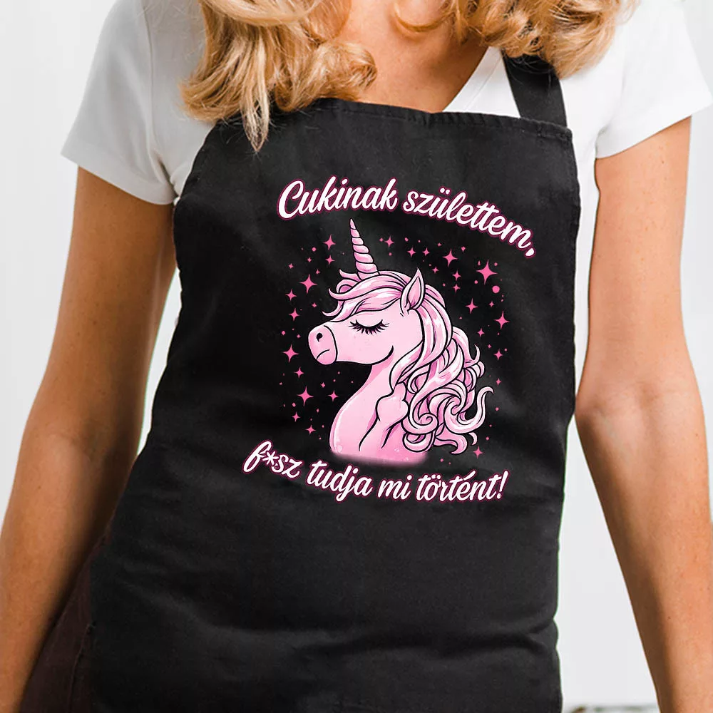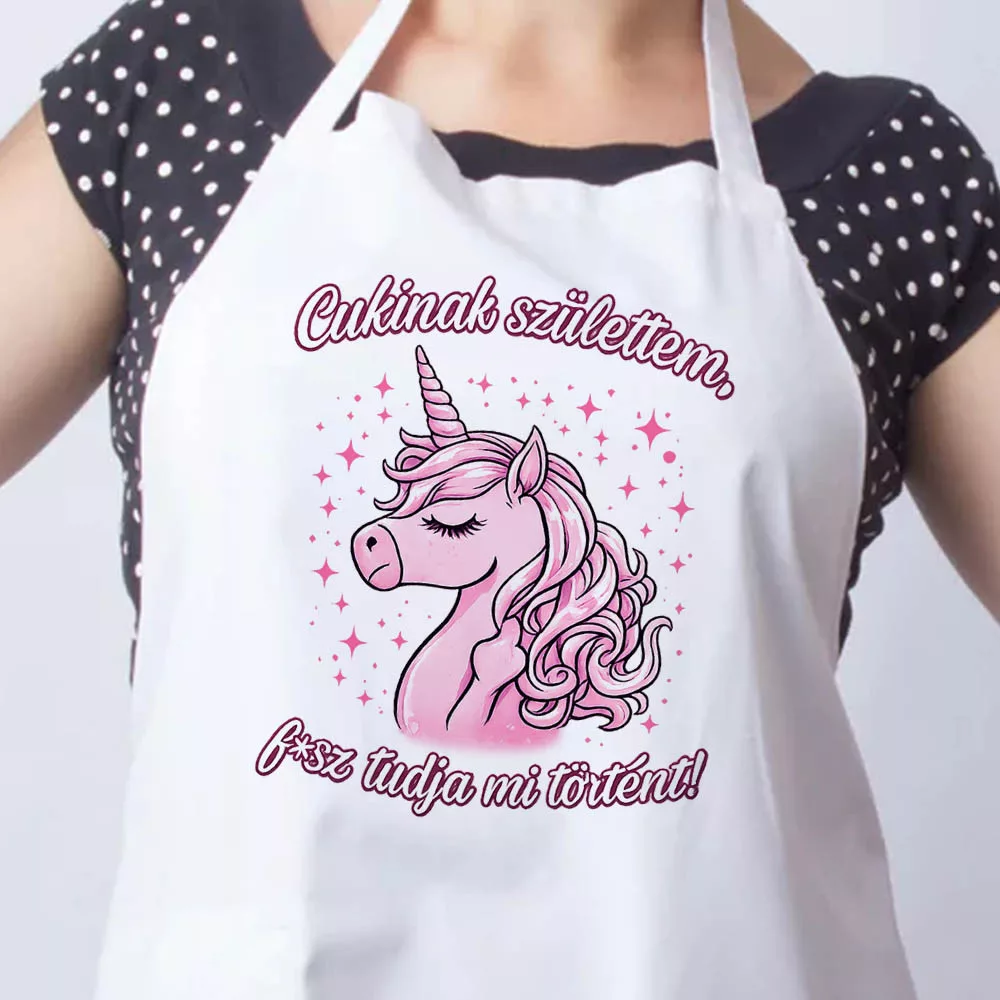 Unikornisos kötény, cukinak születtem. Ez az egyedi unikornisos kötény tökéletes választás azoknak, akik szeretik a humoros, szókimondó és figyelemfelkeltő konyhai kiegészítőket. A rózsaszín unikornis minta és a merész „Cukinak születtem, f*sz tudja mi történt!” felirat igazán különlegessé teszi ezt a darabot, így garantáltan mosolyt csal az arcokra főzés, sütés vagy grillezés közben is.