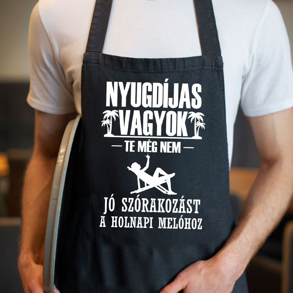 - Fekete kötényen DTF eljárással készül a nyomtatás, amely élénk, kontrasztos megjelenést és strapabíró nyomatot biztosít.