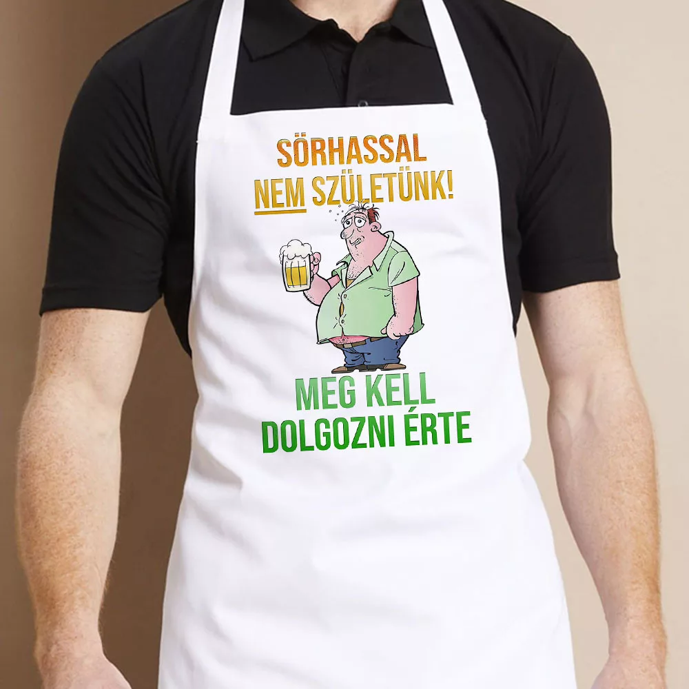 Sörös vicces kötény, sörhasért dolgozni kell. Alkohol témájú feliratos vicces kötény sör kedvelőknek. Sörhassal nem születünk, meg kell dolgozni érte vicces felirattal tréfás ajándék szülinapra, névnapra vagy bármilyen olyan alkalomra amikor egy vicces ajándékot szeretnél átadni. A kötény fekete és fehér színben is rendelhető.