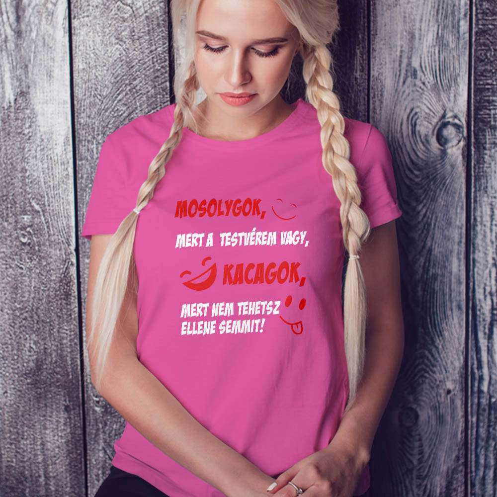 Vicces női póló testvérnek, nem tehetsz ellene. Mosolygok mert a testvérem vagy, kacagok, mert nem tehetsz ellen semmit humoros feliratos ajándék női póló testvéreknek. Rendeld meg hugodnak, nővérednek a mosoly és kacagás biztosan nem marad el.