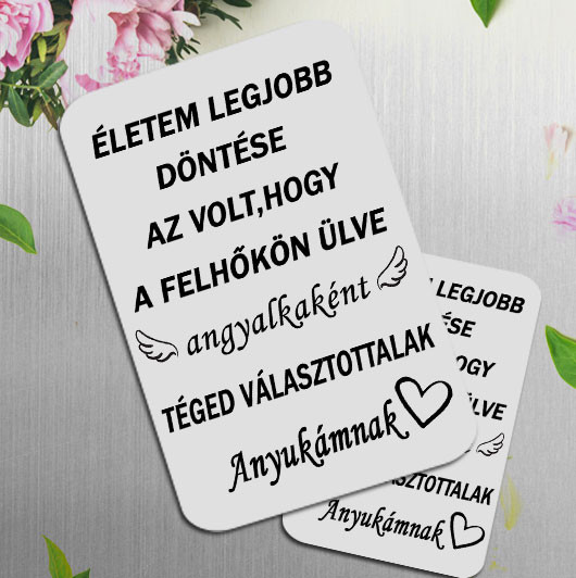 Hűtőmágnes anyának, idézetes hűtőmágnes édesanyáknak, ajándék anyák napjára, születésnapra."Életem legjobb döntése volt, hogy a felhőkön ülve angyalként Téged választottalak Anyukámnak" Mérete 9x6,5 cm, anyaga 1 mm vastag mágnes lap, háttér színe fehér (enyhén csillogó).