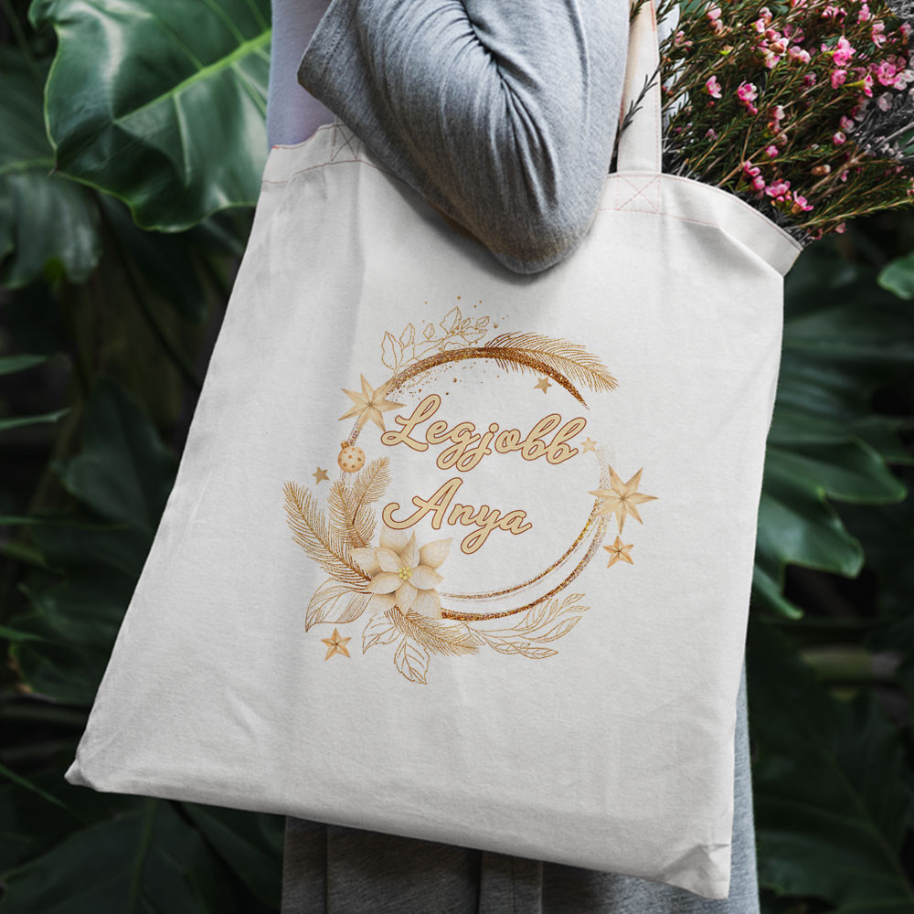 Ajándék karácsonyra, legjobb anya vászontáska. Arany színű gyönyörű minta a legjobb anya felirattal. Karácsonyi meglepetés a legjobb édesanyának.
