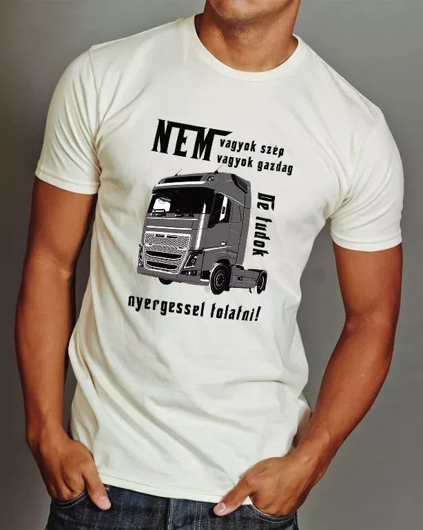 Kamionos póló, nyergessel tolatni. Póló nyomtatás az alábbi felirattal: "Nem vagyok szép, gazdag de tudok nyergessel tolatni!" és kamion motívummal. Tökéletes ajándék születésnapra, névnapra. Most akciós áron 1 darab van készleten.