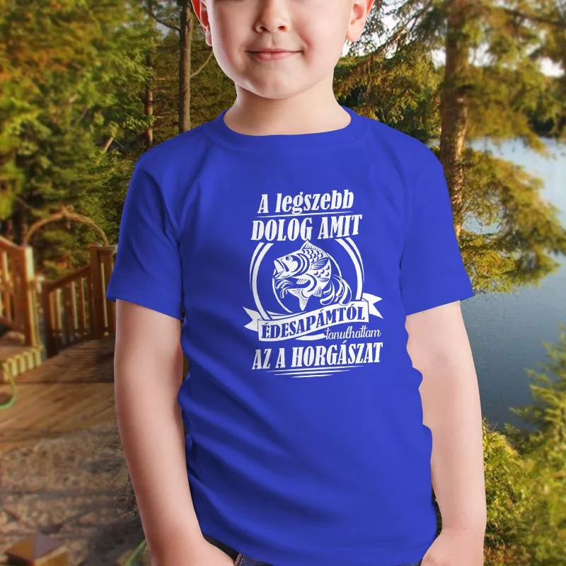 Horgász gyerek póló, Édesapámtól tanulhattam. A legszebb dolog amit Édesapámtól tanulhattam az a horgászat. A legjobb Édesapának, aki mellesleg horgász is. Apának és lányának, fiának ajándék születésnapra, névnapra. Most akciósan csak 1 darab kapható.