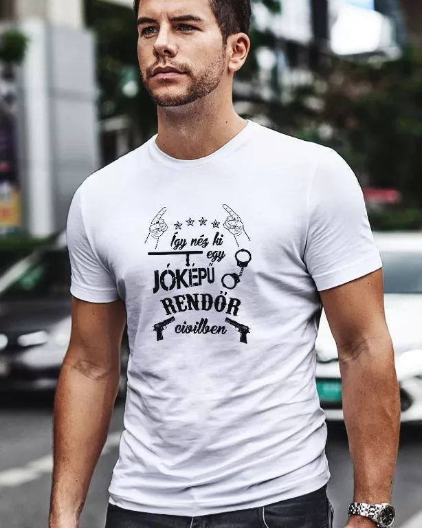 Ajándék rendőröknek, jóképű rendőr. Így néz ki egy jóképű rendőr civilben férfi póló felirattal rendőr barátodnak, férjednek. Lepd meg születésnapján, névnapján egy ilyen pólóval, hogy tudja számodra ő a leghelyesebb rendőr a világon. Most akciós áron 1 darab van készleten.