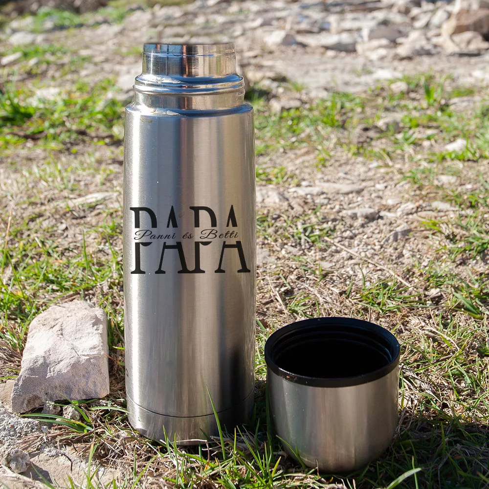 Apák napi ajándék, unokák nevével termosz. Egy kedves ajándék Nagypapáknak apák napjára, személyre szabható unoka neves termosz születésnapra, névnapra is kiváló meglepetés. termosz mérete 500ml vagy 750ml, anyaga rozsdamentes acél.