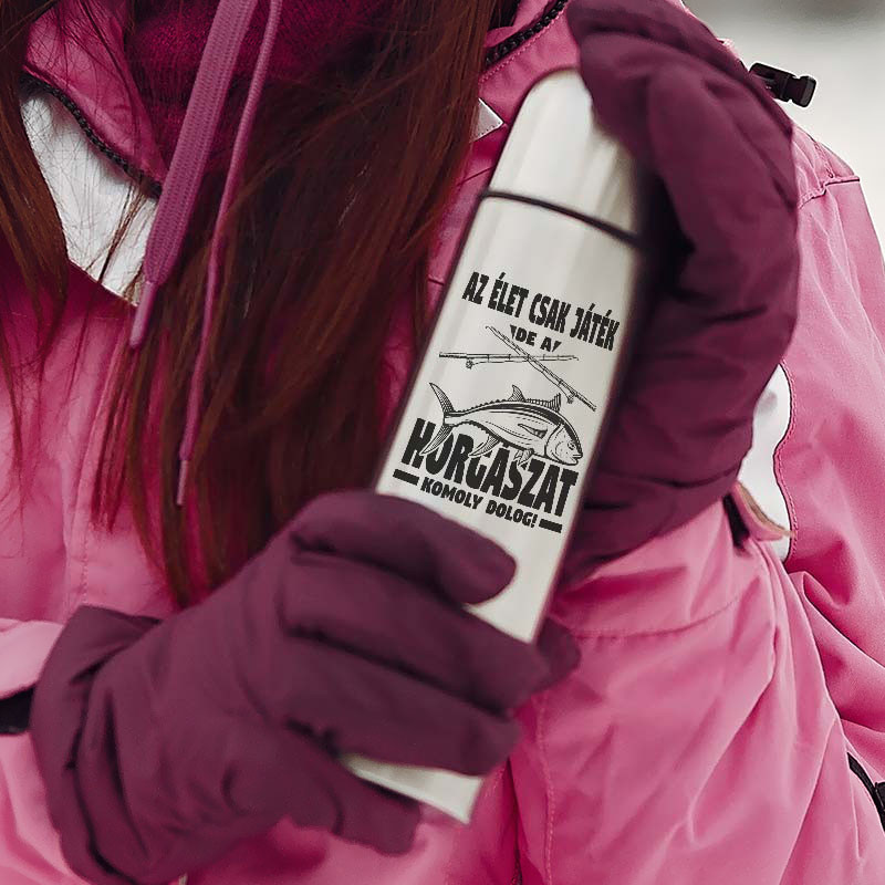 Humoros pecás termosz, horgászat komoly dolog. Az élet csak játék, de a horgászat komoly dolog vicces mintás termosz a horgászat megszállotjainak névnapra, születésnapra legjobb meglepetés. Egy igazi horgásznak nem hiányozhat egy ilyen termosz a hátizsákjából, ha mégsem található még meg ott ideje pótolni!