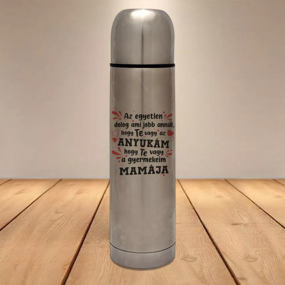 Ajándék nagyszülőnek, termosz nagymamának "Az egyetlen dolog ami jobb annál, hogy Te vagy az anyukám, hogy te vagy a gyermekem mamája" felirattal. Lepd meg anyukádat egy termosszal, születésnapra, névnapra vagy akár karácsonyi ajándéknak is ideális választás. Termoszaink rozsda mentes acél anyagból készültek, 500ml-es és 750ml-es változatban elérhetőek, kupakja pohárként is használható.