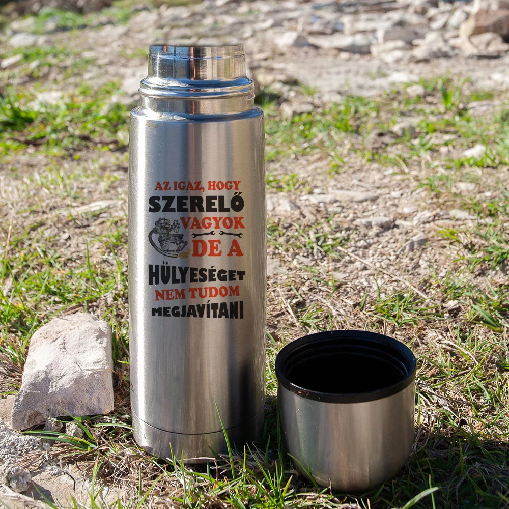 Vicces termosz szerelőnek, hülyeséget javítani. Az igaz, hogy szerelő vagyok, de a hülyeséget nem tudom megjavítani humoros feliratos termosz. Ajándék ezermestereknek, rozsdamentes acél termosz.